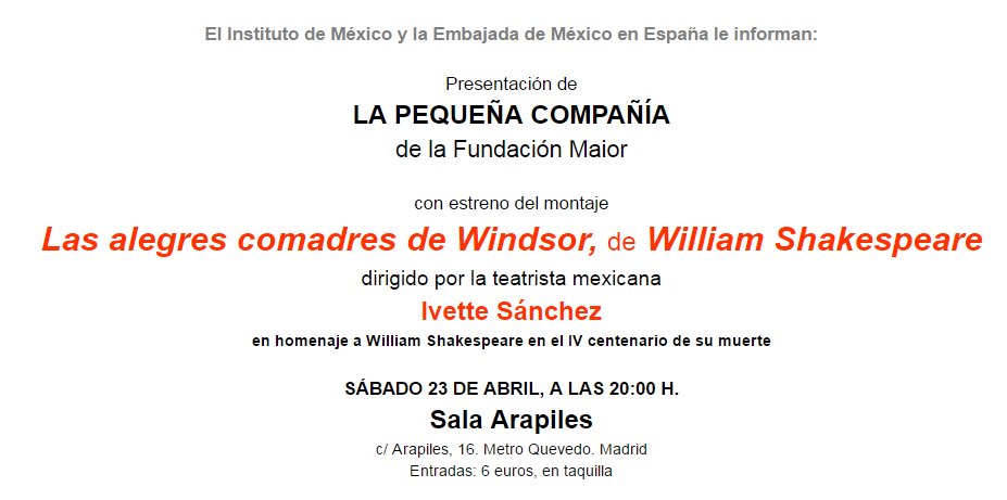 Asi pues, y tomando en cuenta este importante fecha en la cronología del autor inglés, la Pequeña Compañía de la Fundación Maior de Madrid presentará su versión de Las alegres comadres de Windsor, del creador de Hamlet, bajo la dirección de la teatrista mexicana Ivette Irene Sánchez Arroyo. La comedia shakespeariana es la única en la que uno de los grandes personajes de su autor, Falstaff, es el protagonista absoluto. Esta compañía echó a andar en 2011 cuando se reunieron un grupo de amigos que querían, según explican, conocer y ofrecer a otros el arte del teatro.