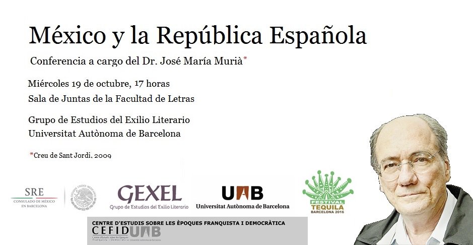 El hijo mexicano de un matrimonio español que viajó a México huyendo de la guerra en aquellos tiempos, regresa ahora para dictar una conferencia sobre esa etapa de la historia moderna y, además, desde la perspectiva de alguien a quien le unen lazos afectivos con ambas naciones. Nos referimos al Dr. José María Muriá Rouret quien hoy miércoles 19 de octubre del 2016 a partir de las 17:00 horas dictará la conferencia "México y la República Española" en la Sala de Juntas de la Facultad de Letras de la Universidad Autónoma de Barcelona